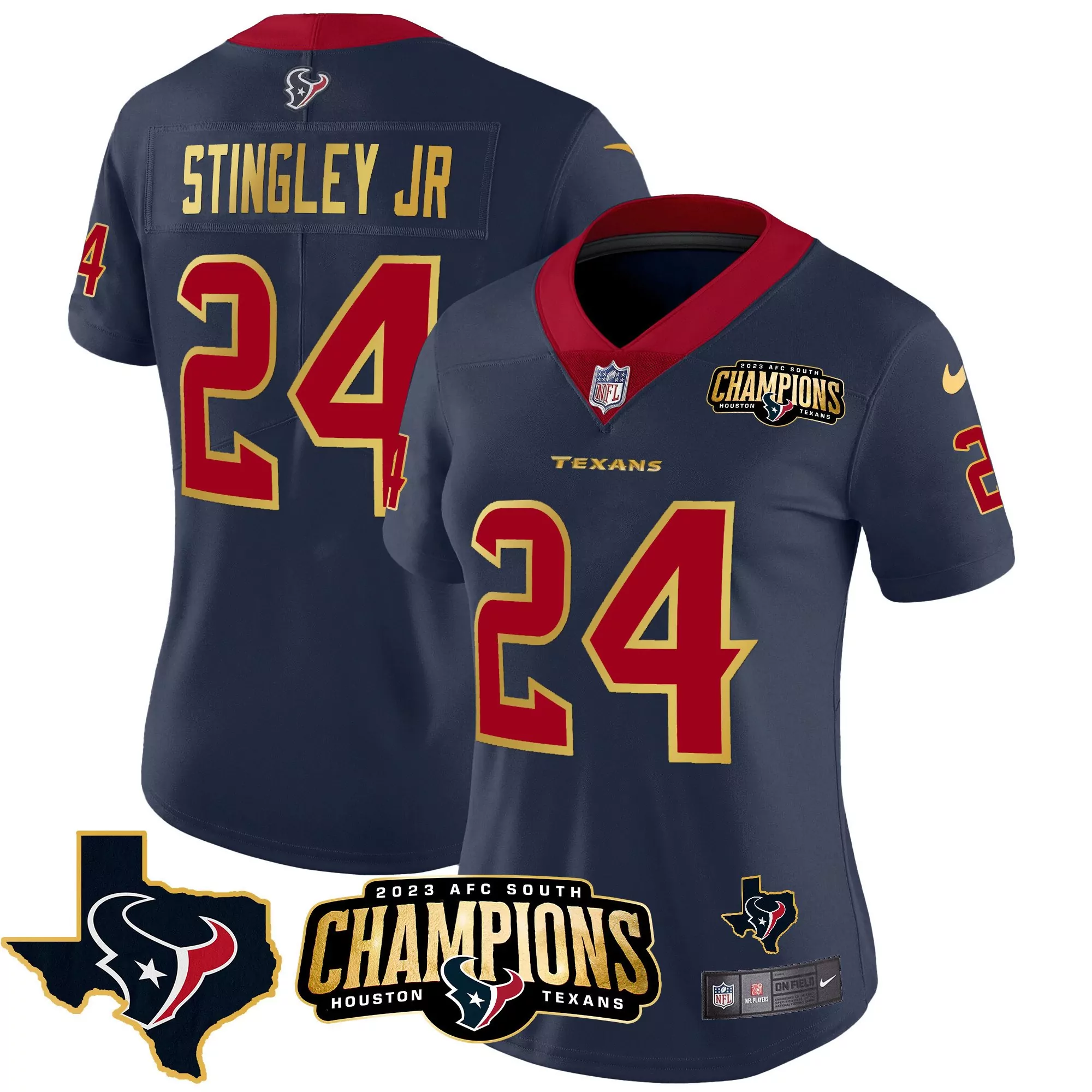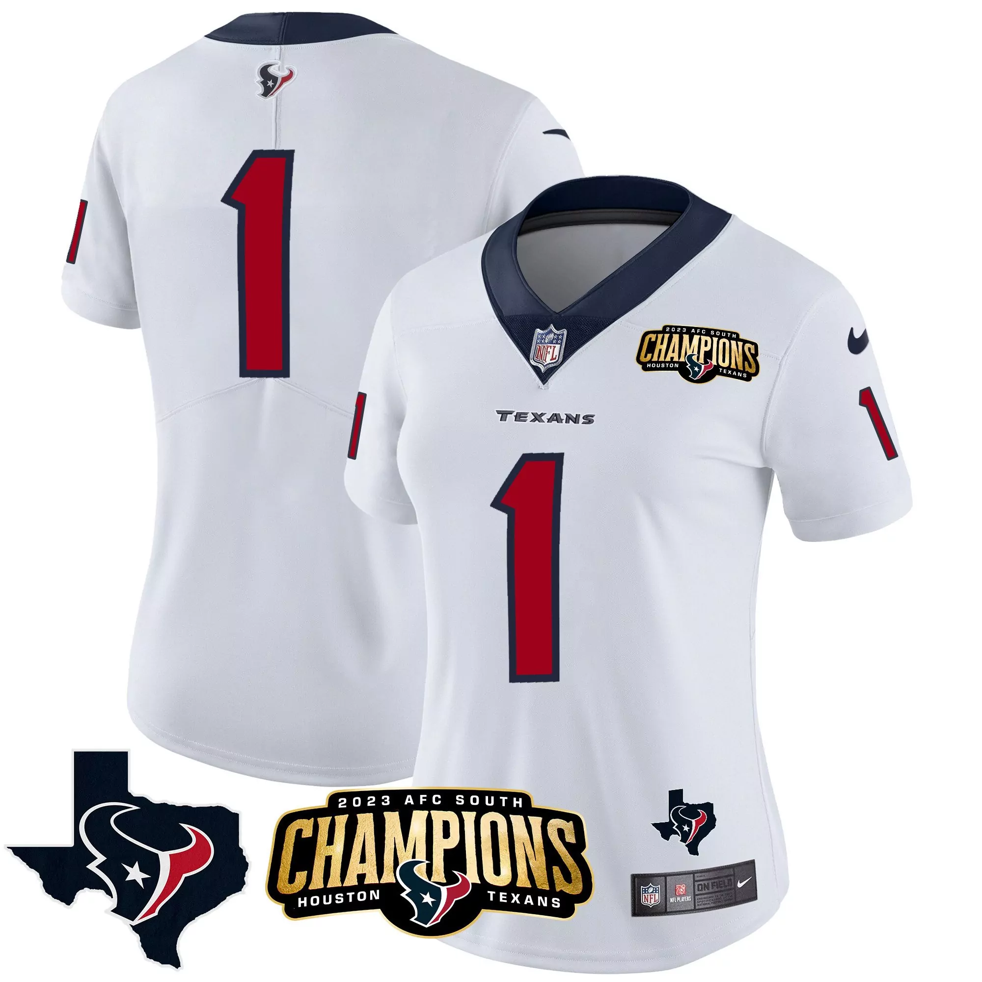 1 houston texans women s all stitched vapor jersey 2023 red;2023 houston texans white custom jersey afc south champions all stitched vapor;2023 houston texans women s stingley jr 24 navy all stitched vapor jersey champions edition;2023 women s 1 houston texans all stitched vapor jersey white with patch;2023 women s houston texans 1 champions all stitched vapor jersey white red