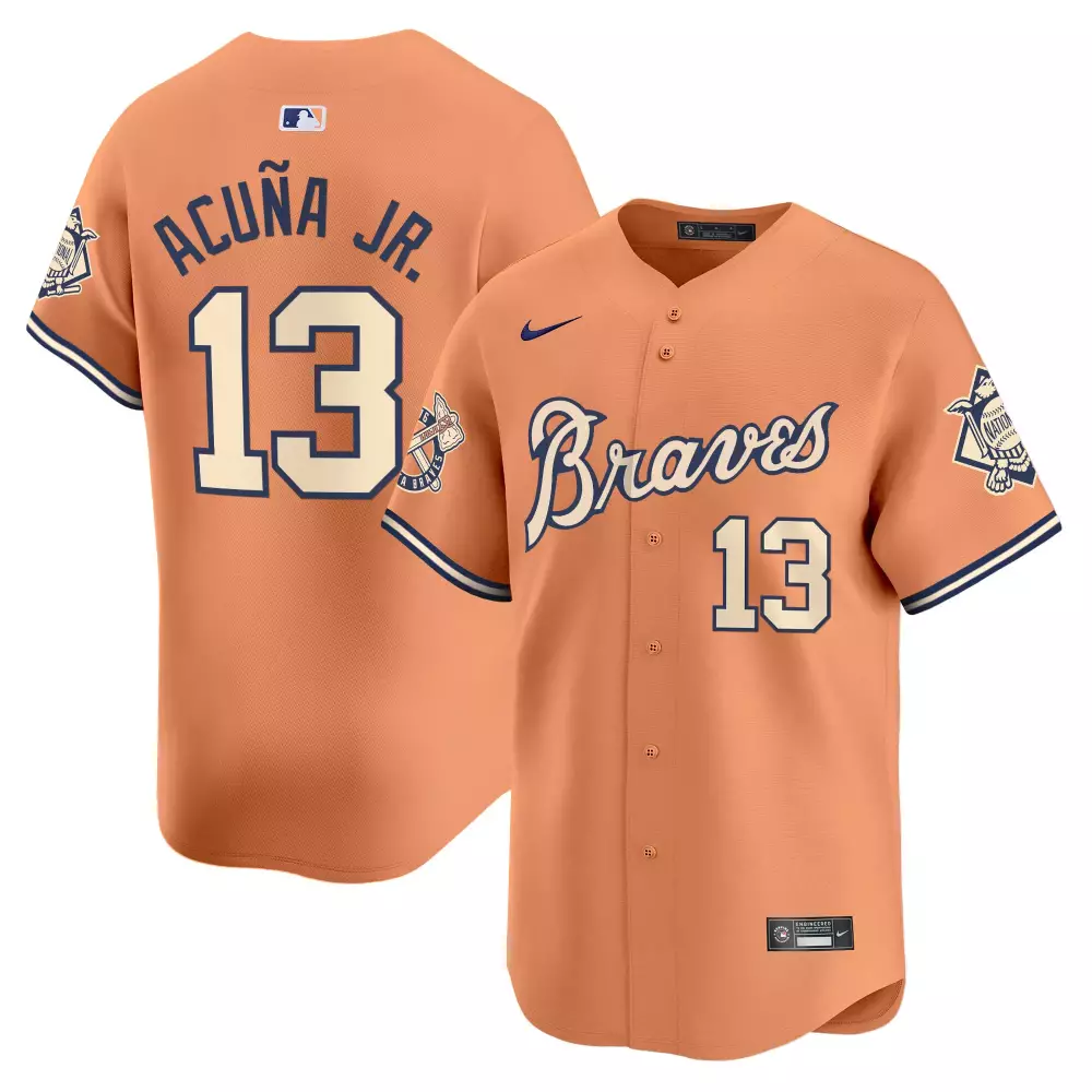 acuna jr 13 atlanta braves cream women s stitched jersey the big peach 2023 name patch;acuna jr 13 atlanta braves gold alternate jersey all stitched men s style 2023;acuna jr 13 atlanta braves green stitched jersey 2023 unisex joker style name patch;acuna jr 13 atlanta braves green stitched jersey men s style name patch 2023;acuna jr 13 atlanta braves men s orange stitched jersey name patch 2022
