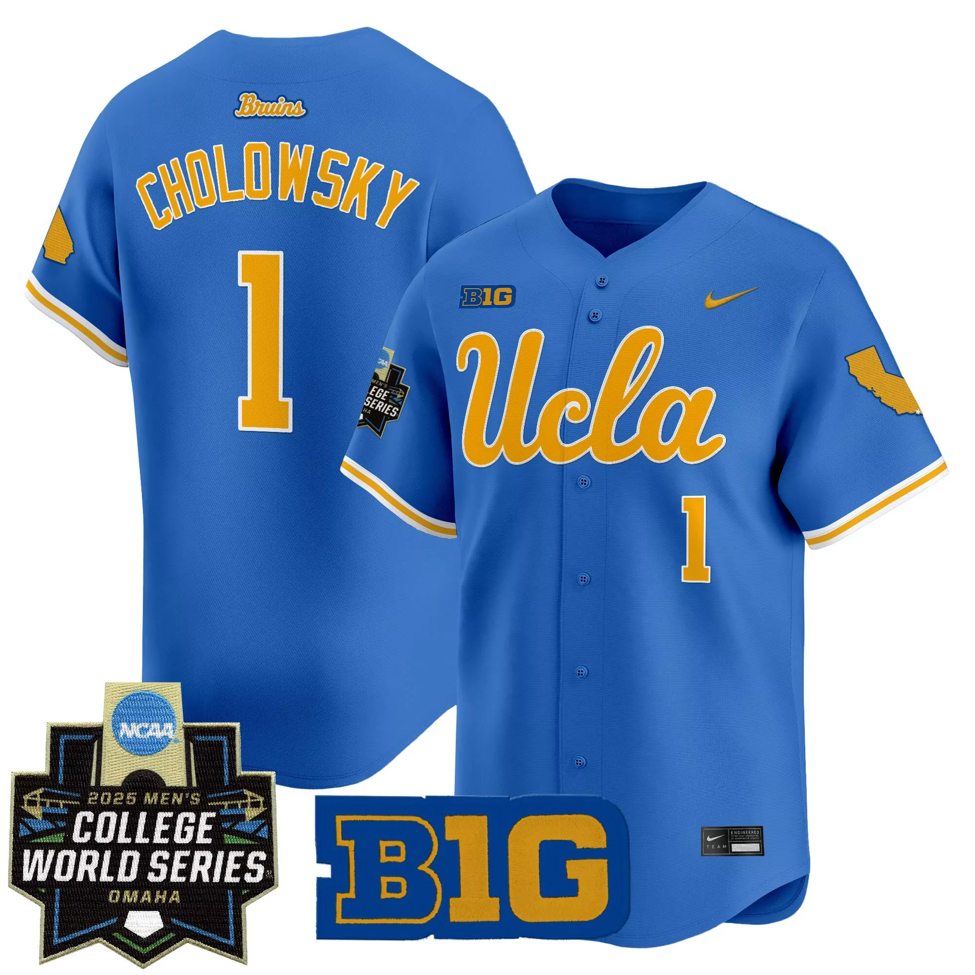 cholowsky 1 women s ucla bruins 2025 world series vapor jersey white stitched embroidered patches;cholowsky 1 women s ucla bruins white vapor jersey with ncaa 2025 world series patch;cj bott 25 men s ucla bruins white vapor jersey with 2025 college world series patch;cj bott 25 men s vapor premier limited jersey gray ucla bruins 2025 college world series;cj bott 25 ucla bruins 2025 men s white vapor premier limited jersey with b1g patch