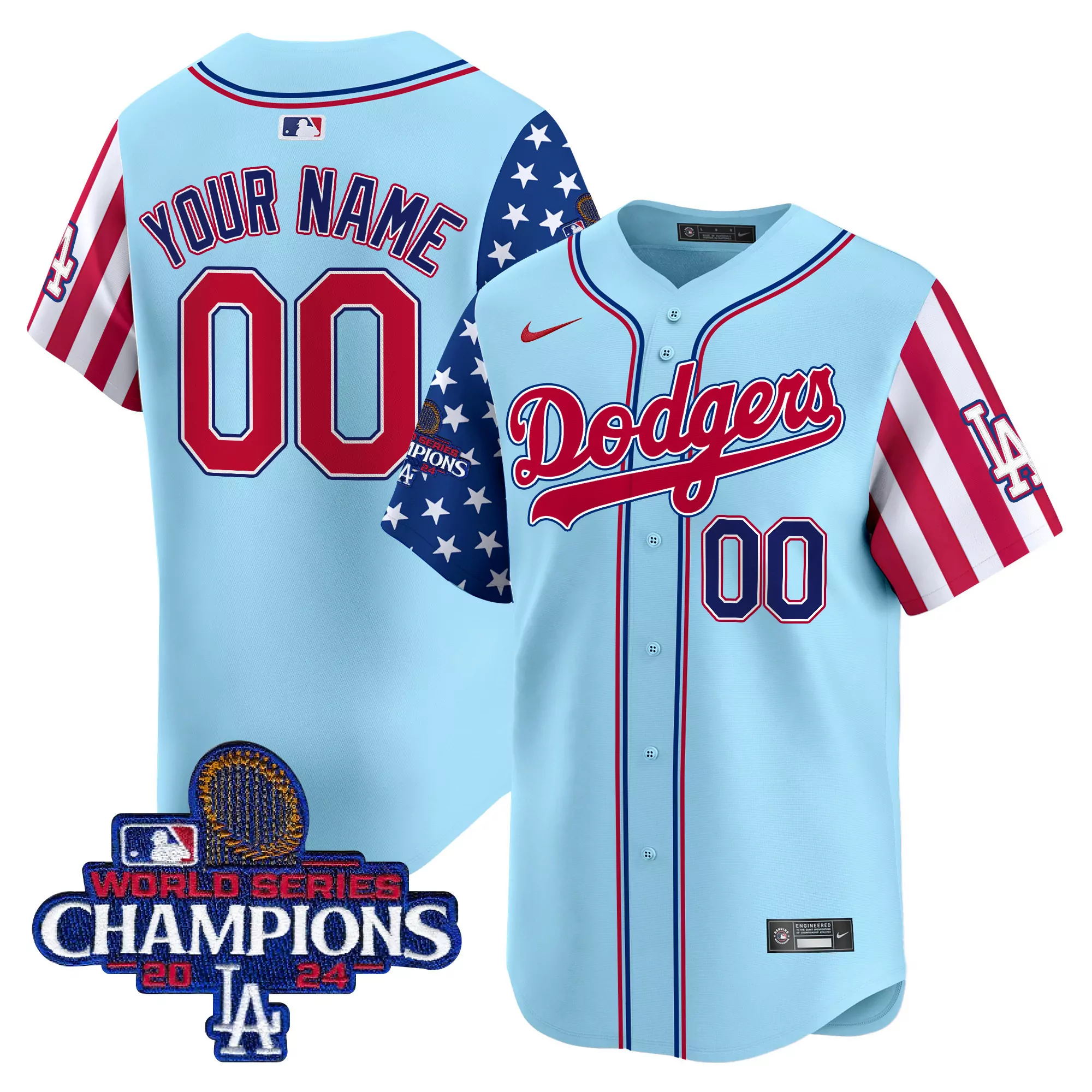 Los Angeles Dodgers 2023 Vapor Jersey Yellow Stitched Embroidered Pirate Patch Men S Style Your Name 00;Los Angeles Dodgers 2023 Vapor Jersey Your Name 00 Navy Stitched Embroidered Patch Men S Style;Los Angeles Dodgers 2024 World Series Champions Black Vapor Jersey Vin 44 Men S Stitched Embroidered Patch;Los Angeles Dodgers 2024 World Series Champions Custom Jersey Light Blue With American Flag Sleeves;Los Angeles Dodgers 2024 World Series Champions Custom Jersey White Red Blue