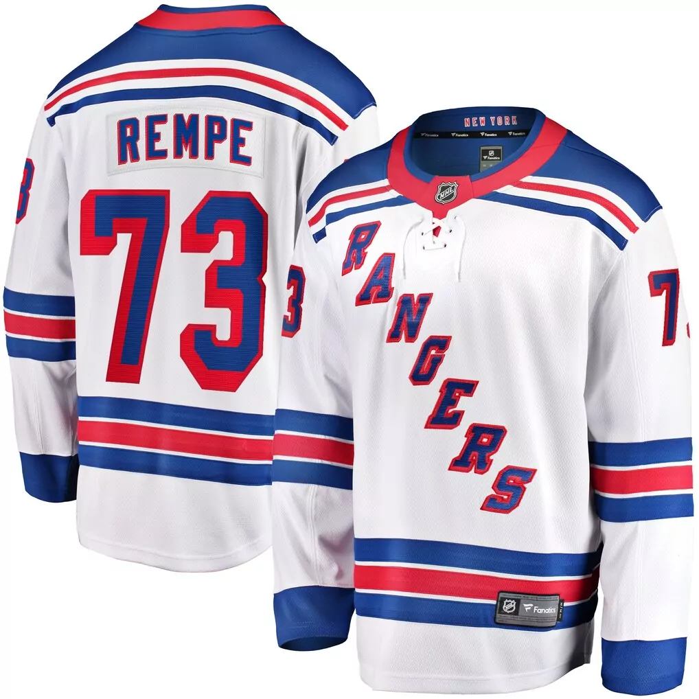 mark messier new york rangers 1993 94 power play jersey white;mark messier new york rangers mitchell ness big tall 1993 94 blue line 2 0 jersey blue;mark messier new york rangers youth power play 2 0 player jersey with captain patch royal;matt rempe new york rangers fanatics away premier breakaway player jersey white;matt rempe new york rangers fanatics home breakaway jersey blue