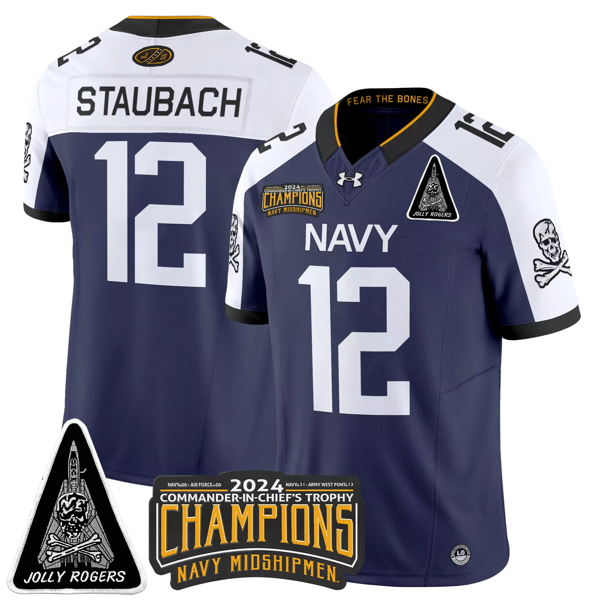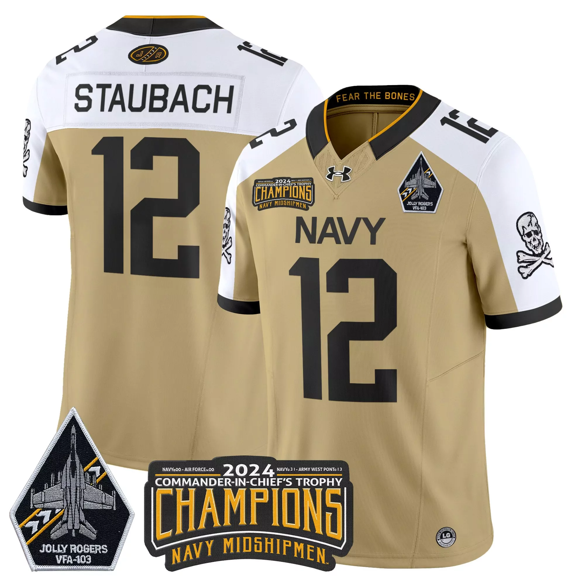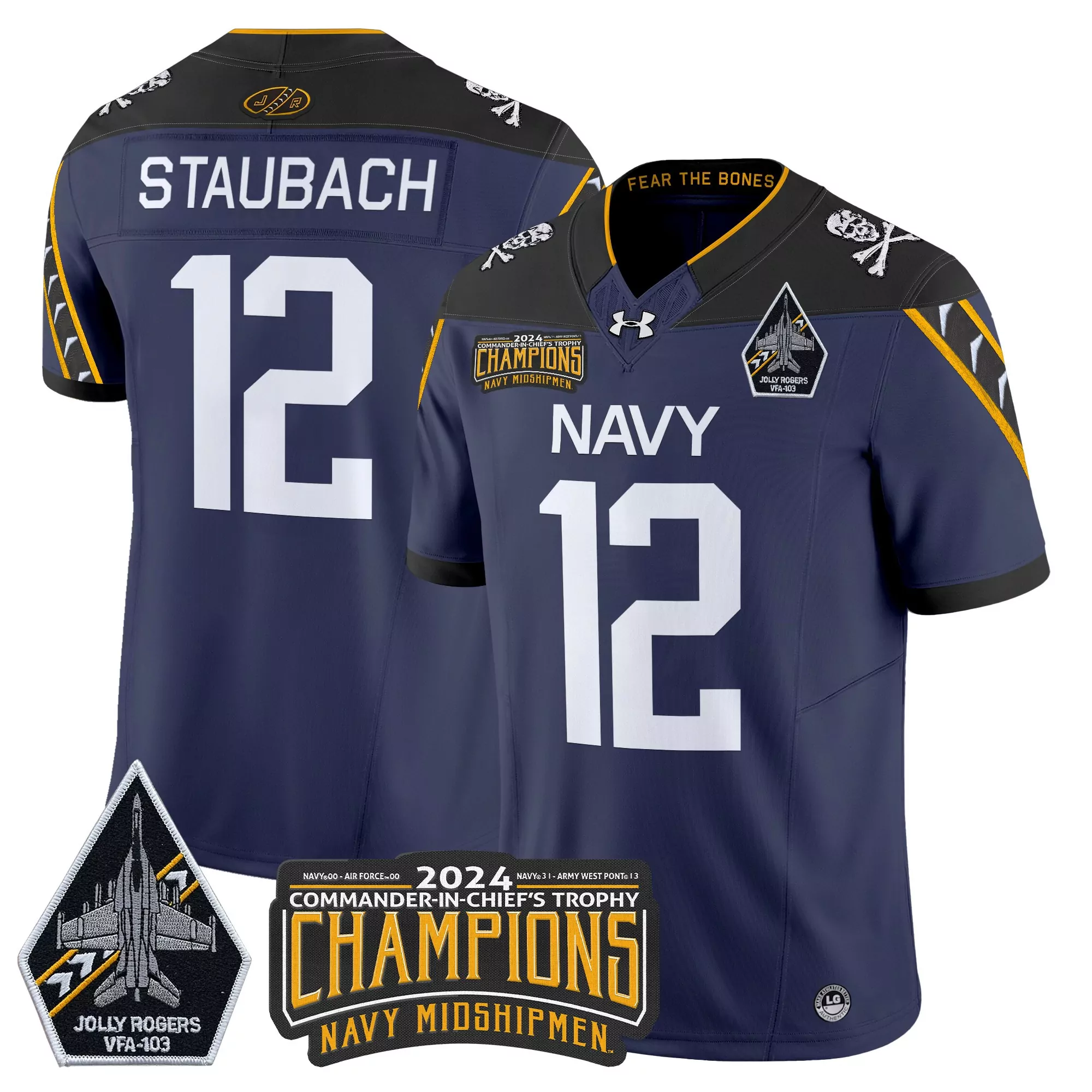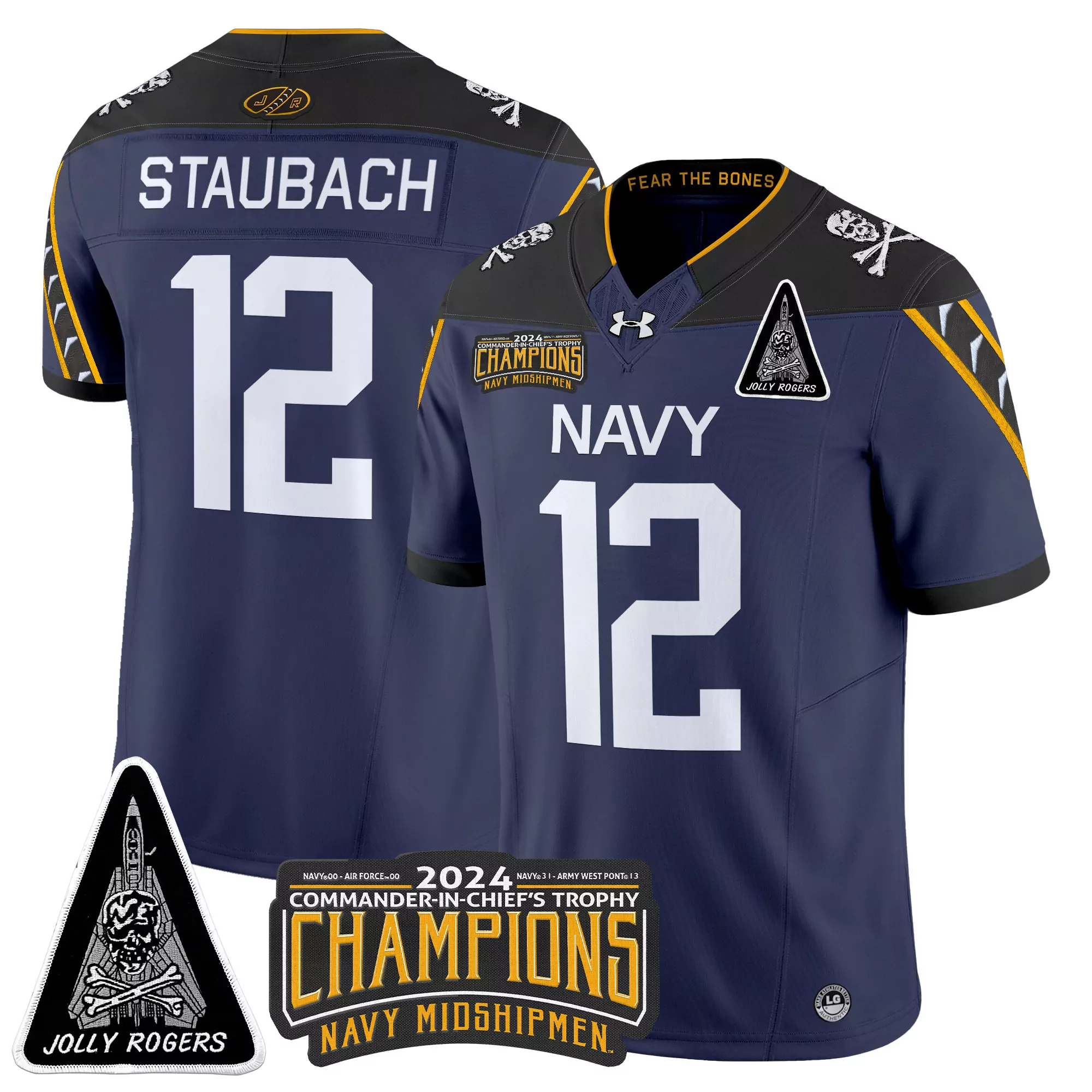 staubach 12 men s stitched vapor jersey 2024 champions navy midshipmen gold jolly rogers patch