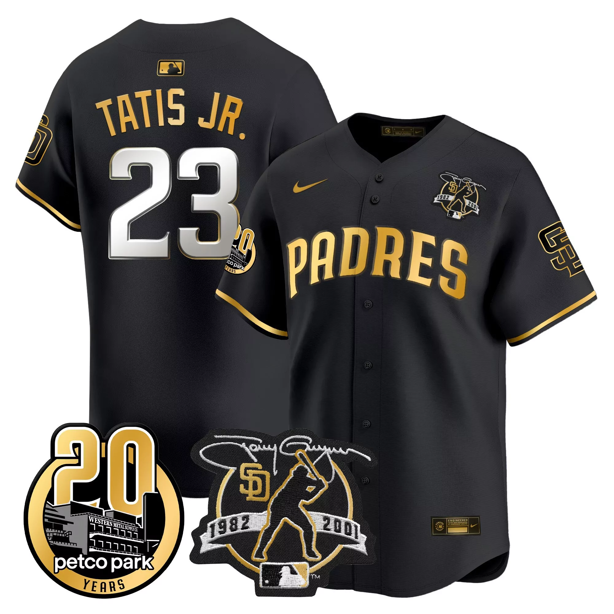 tatis jr 23 men s black san diego padres vapor jersey with 1982 2001 embroidered patch;tatis jr 23 men s black vapor jersey san diego padres 20th anniversary patch 2023;tatis jr 23 men s brown san diego padres stitched vapor jersey armed forces day 2023;tatis jr 23 men s san diego padres 2023 armed forces day stitched vapor jersey olive green;tatis jr 23 men s san diego padres 2023 armed forces day stitched vapor jersey olive green 1