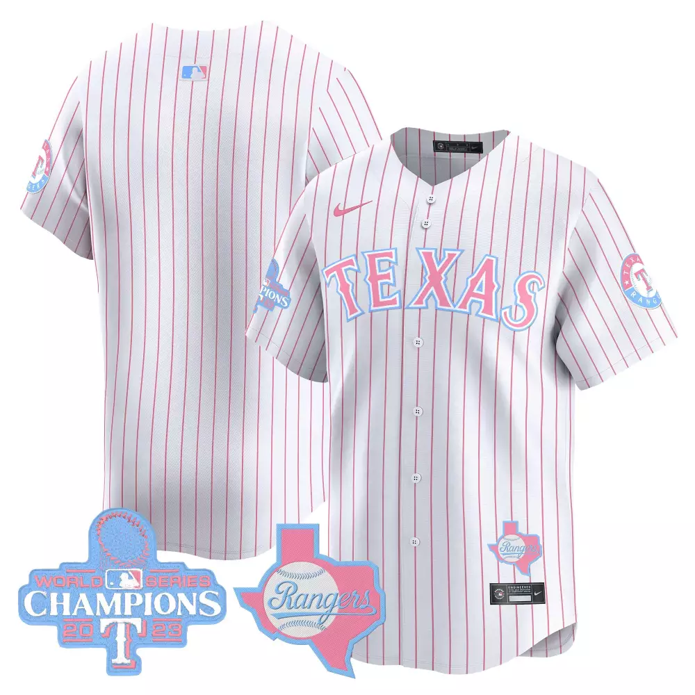 team pink unisex texas rangers bubblegum pink vapor premier limited jersey all stitched;team pinstripe unisex texas rangers bubblegum pink vapor premier limited jersey all stitched;team red mens texas rangers 2023 cool base jersey texas patch all stitched;team red mens texas rangers 2023 flex base jersey texas patch all stitched;team red mens texas rangers 2023 world series champions city connect flex base jersey all stitched
